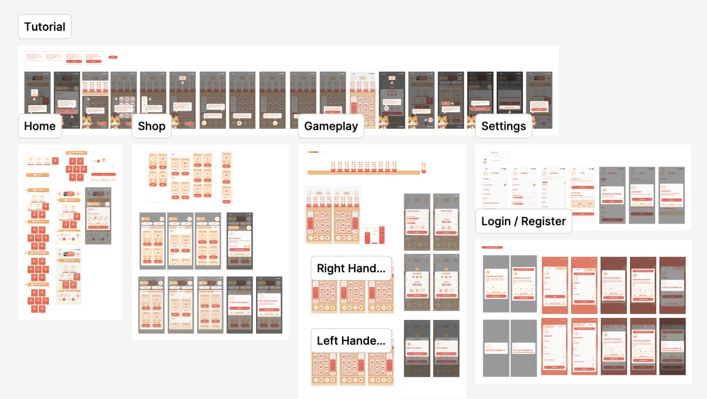 Gameplay, App Navigation, Shop, Settings, tutorial, login, and registration user flows for the app done through traditional whiteboarding.Constraints