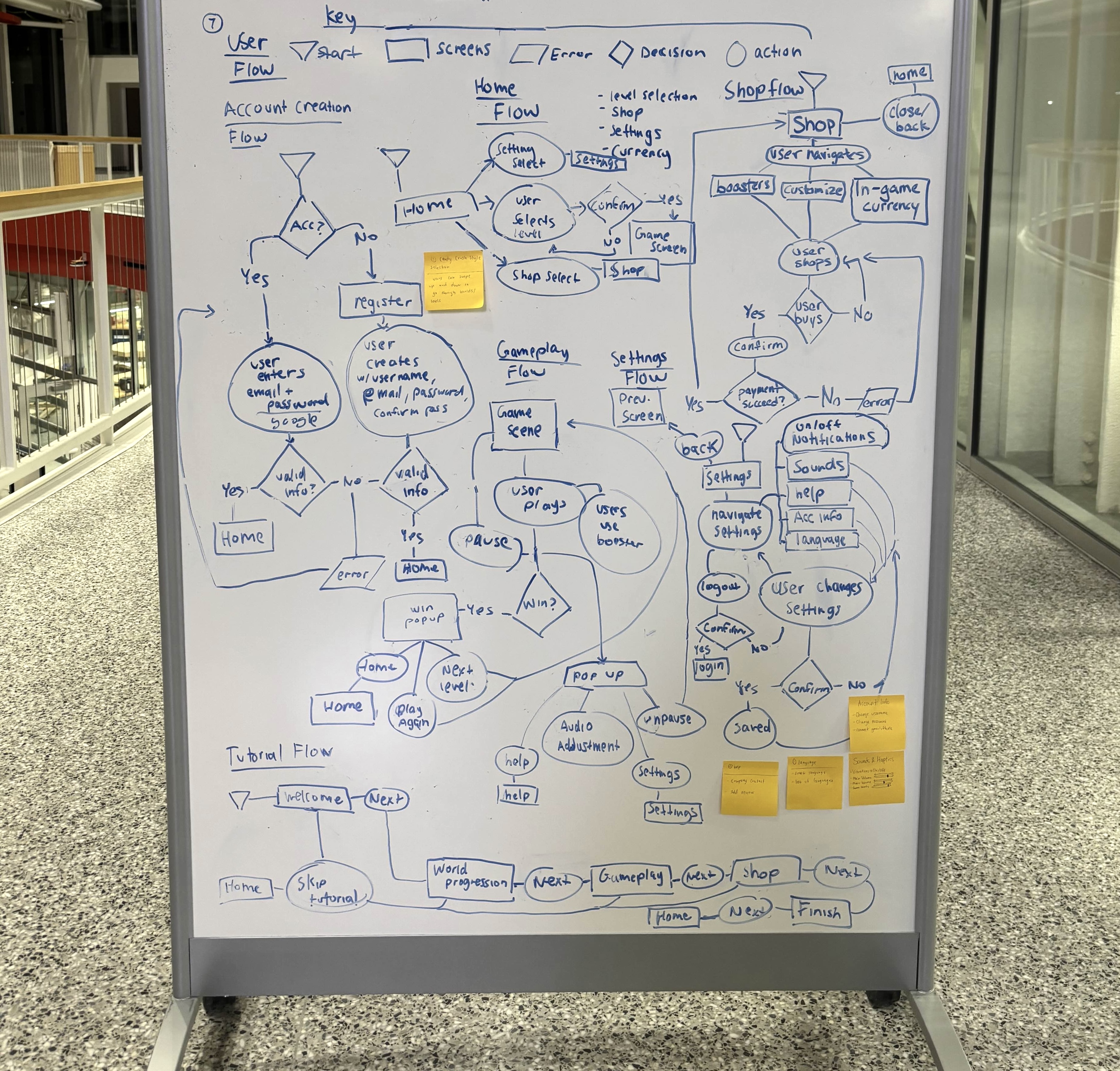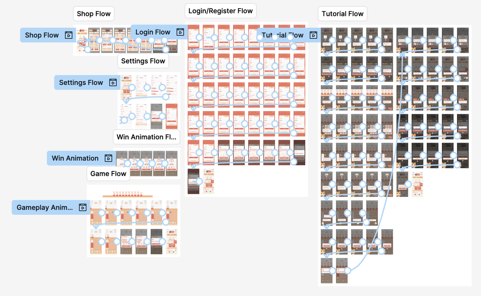 Before design, we created user flows to understand the user's journey through the app. This included flows for login, tutorial, gameplay, app navigation, shop, and settings.