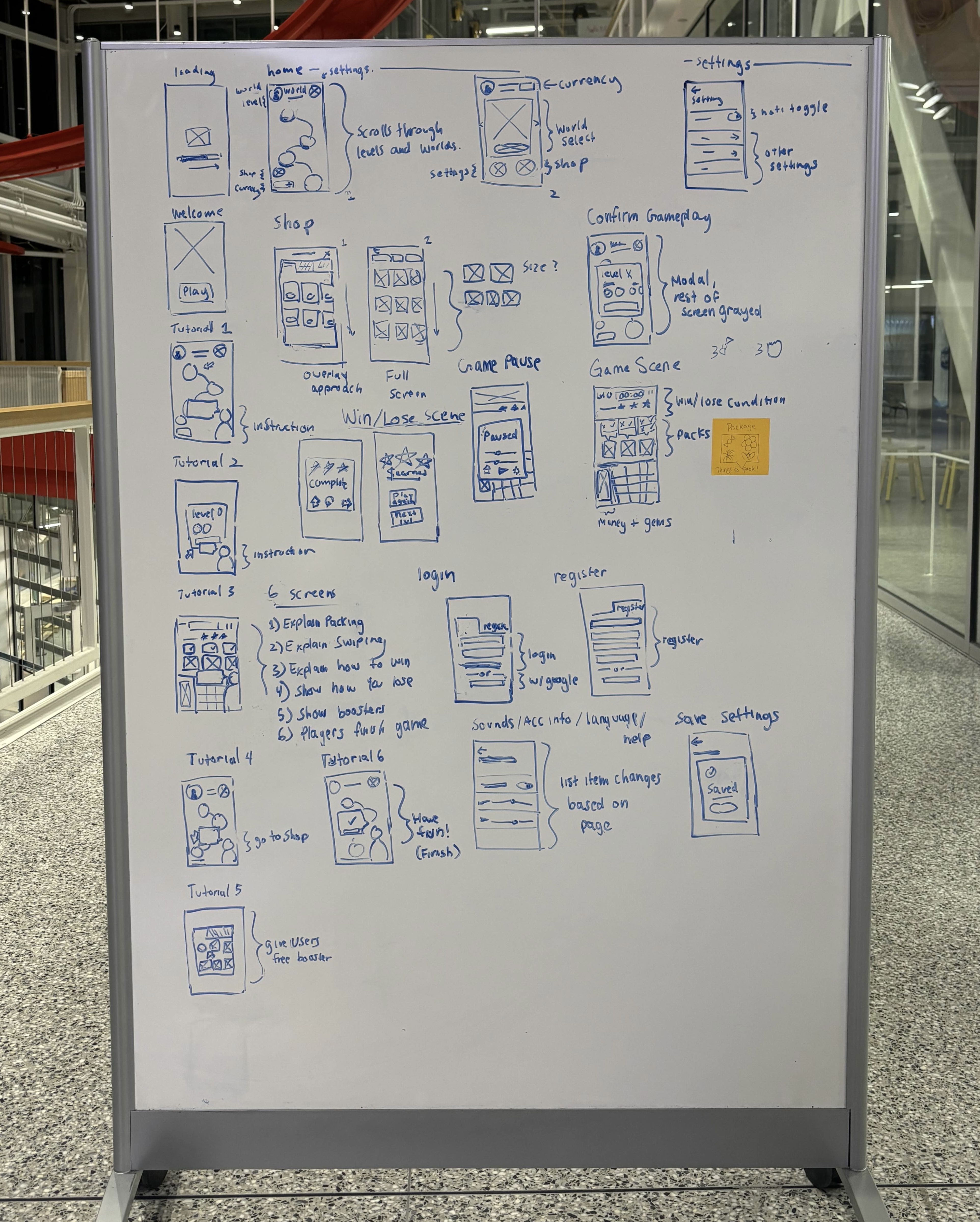 Gameplay, App Navigation, Shop, Settings, tutorial, login, and registration user flows for the app done through traditional whiteboarding.Once we had a clear understanding of the user flows, we created low fidelity wireframes to test it's validity. Throughout the process, we create different iterations for different screens. Our main goal was just to get a feel for the app and and validate the user flows.